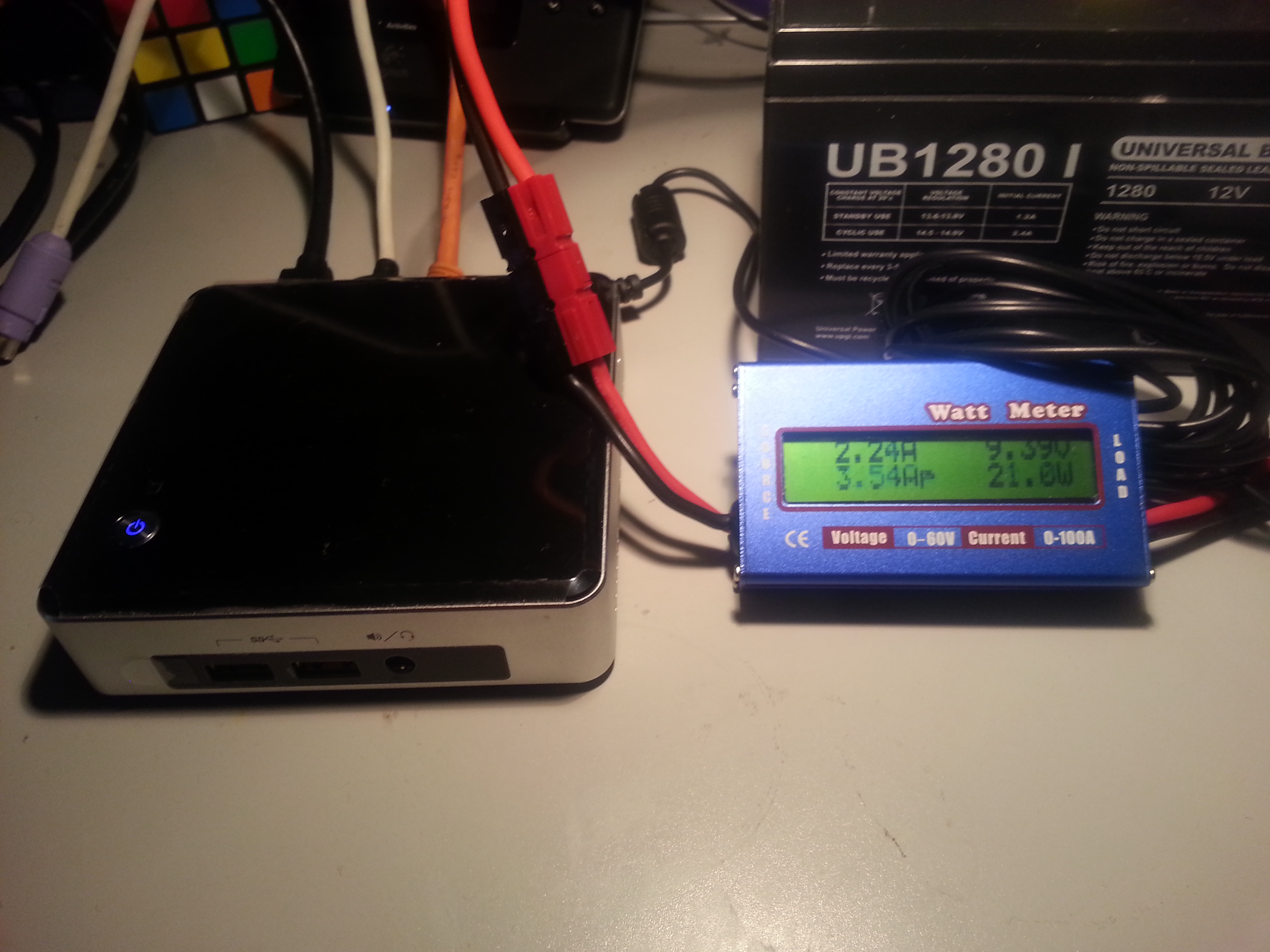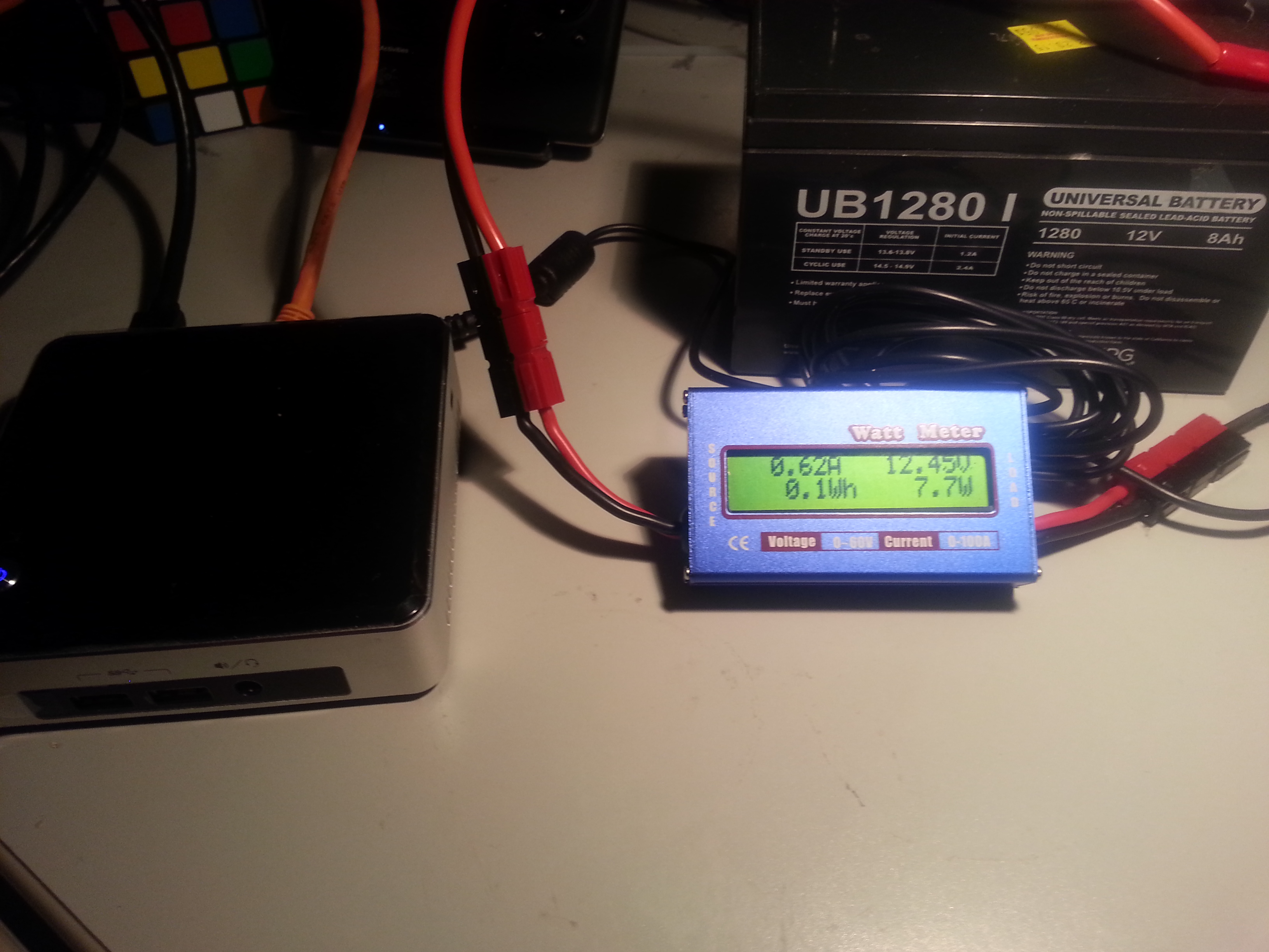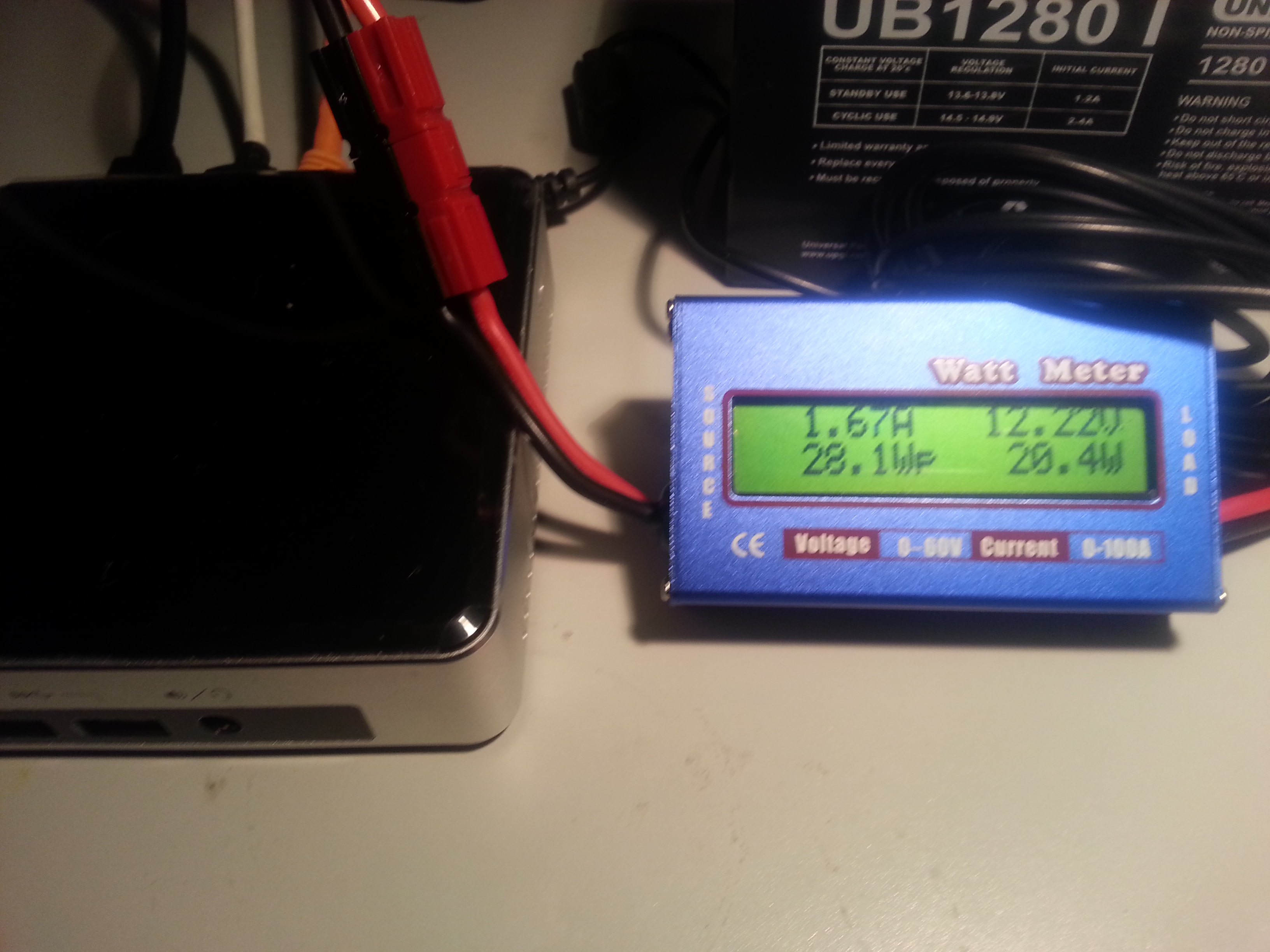 Once I got it setup correctly with the powerpoles, I powered the NUC back up with my linear power supply. It powered up nicely without any problems. During bootup, my inline meter said it was pulling up to 23 watts, but when it got to the desktop screen (within about 10 seconds of total poweron), it was at its idle power usage of 8 watts.